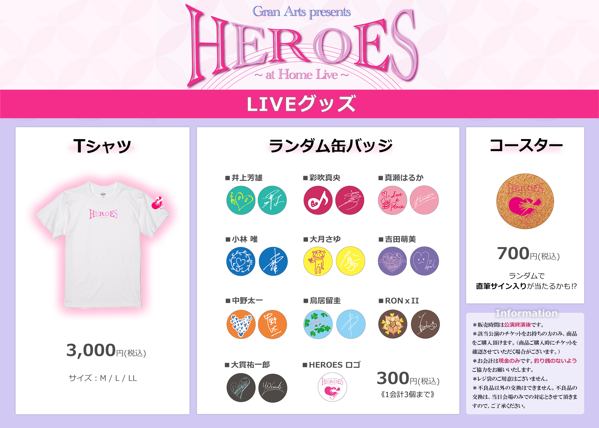 2016年12月にBunkamuraオーチャードホールにて「HEROES~グランアーツスペシャルLIVE~」と題して、井上芳雄をはじめとする所属アーティスト全員が出演する第1回目を開催。2019年2月には、大月さゆと吉田萌美らによる「HEROES~Another version~」を開催。続く2020年10月には、さまざまな制約がある中で「HEROES Another version vol.2 @Online」として無観客配信ライブを実施し、形を変えながらエンターテイメントを届けてまいりました。