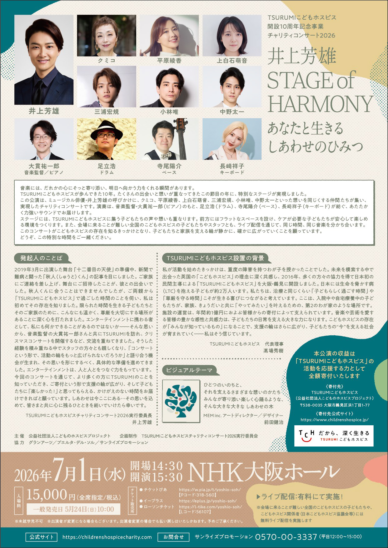 「TSURUMIこどもホスピス開設10周年記念事業チャリティコンサート2026『井上芳雄 STAGE of HARMONY 〜あなたと⽣きる しあわせのひみつ〜』」